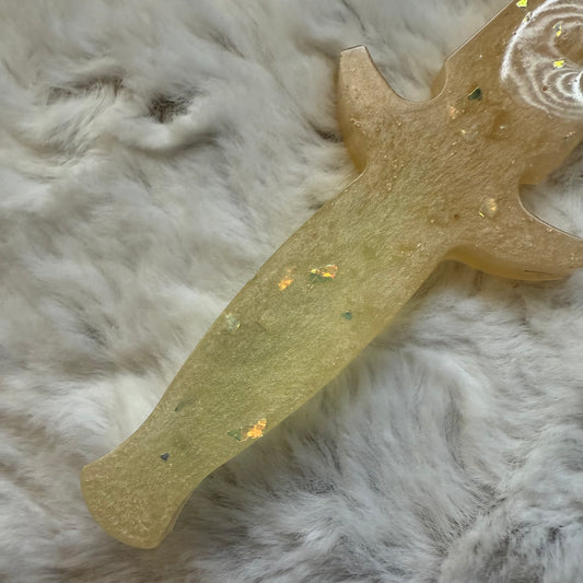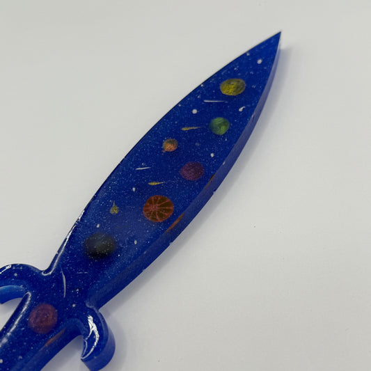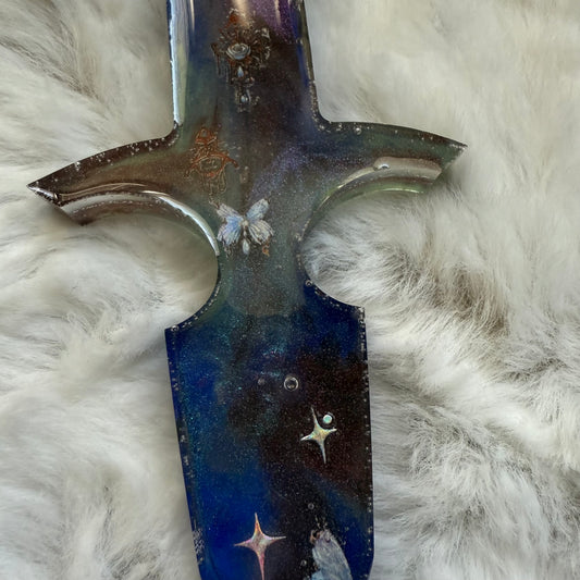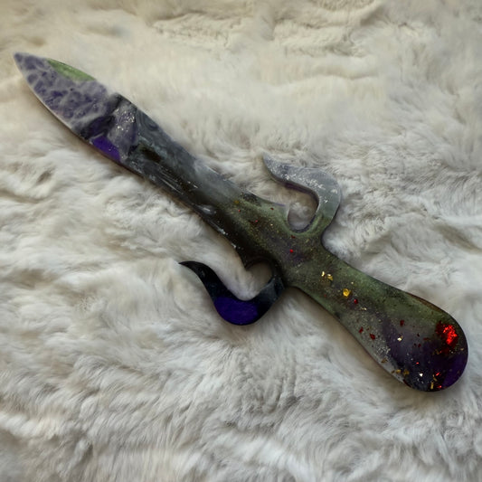 Each dagger is made from high-quality resin, featuring stunning finishes such as marbled swirls, shimmering metallic components, or translucent hues that catch the light beautifully. Whether inspired by ancient warriors, mystical sorcery, or celestial wonders, every piece is carefully designed to complement your character’s story. For display and cosplay purposes only, these daggers bring fantasy to life while remaining safe for conventions, photoshoots, and themed collections. Elevate your roleplay with a Resin Dagger—where art meets adventure.